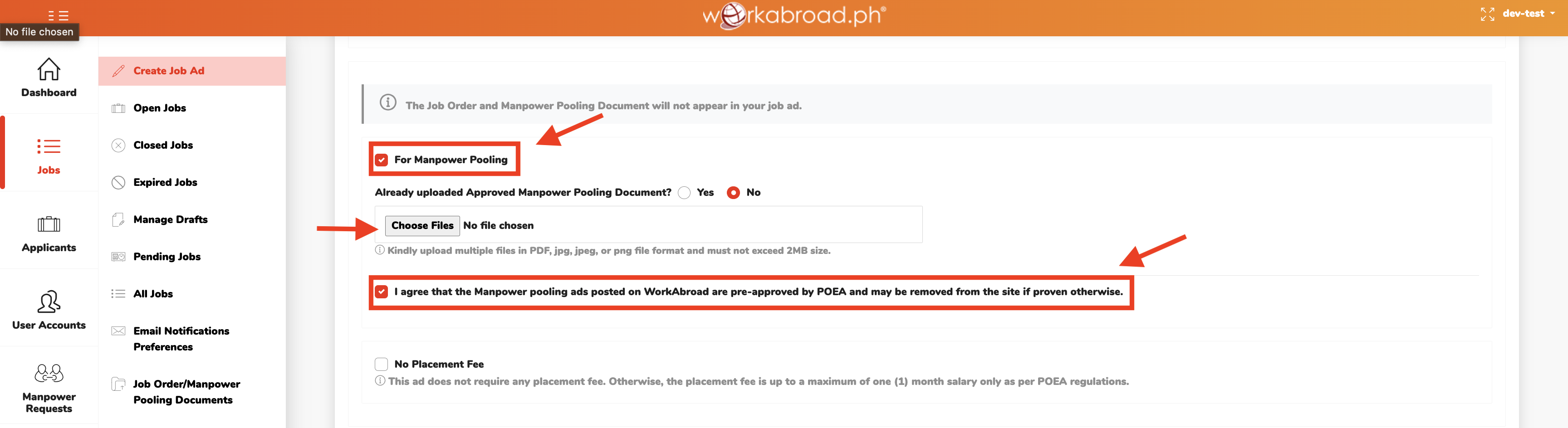| Manpower Pooling | Tick the 'For Manpower Pooling tick-box' if the job ad is for manpower pooling status. Be sure to tick 'I agree that the Manpower pooling ads posted on WorkAbroad are pre-approved by DMW (formerly POEA) and may be removed from the site if proven otherwise.' to confirm DMW's (formerly POEA) approval of your manpower pooling ad. |